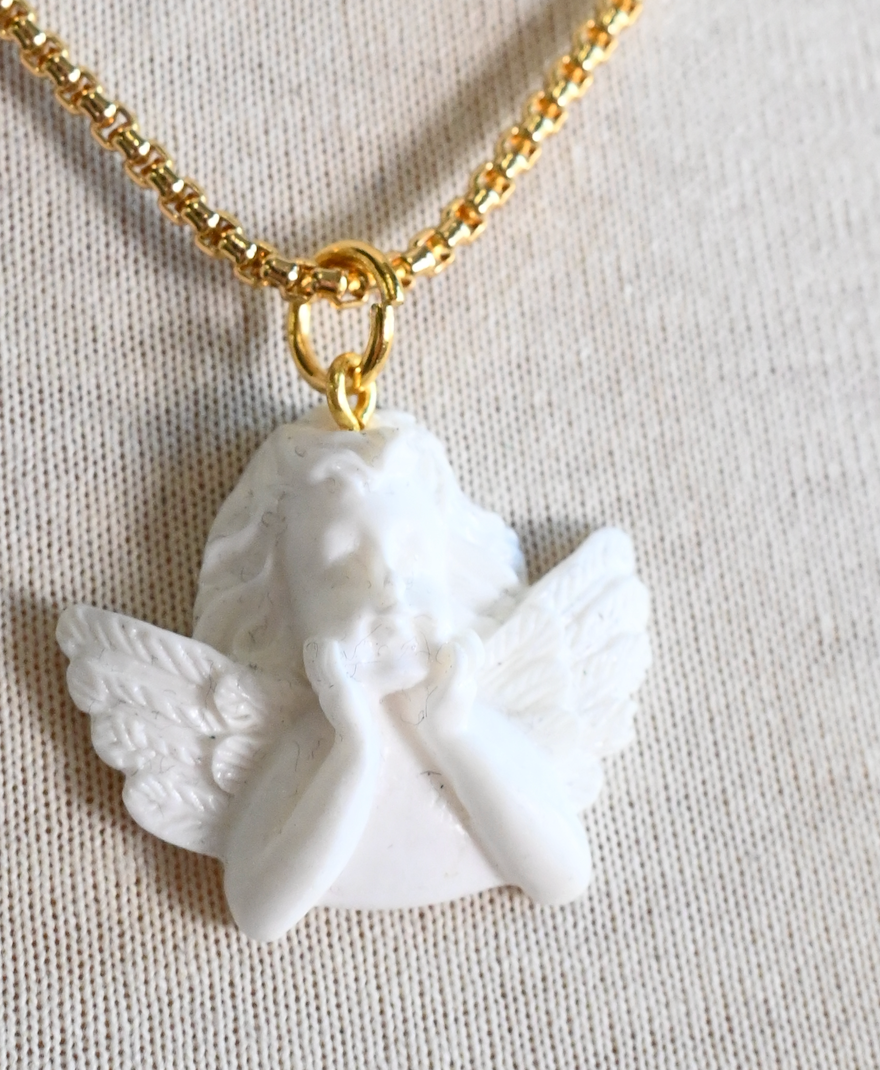 Made with re-purposed molded cherub pendant and anti-tarnish nickel free 18kt gold filled chain and closures.
