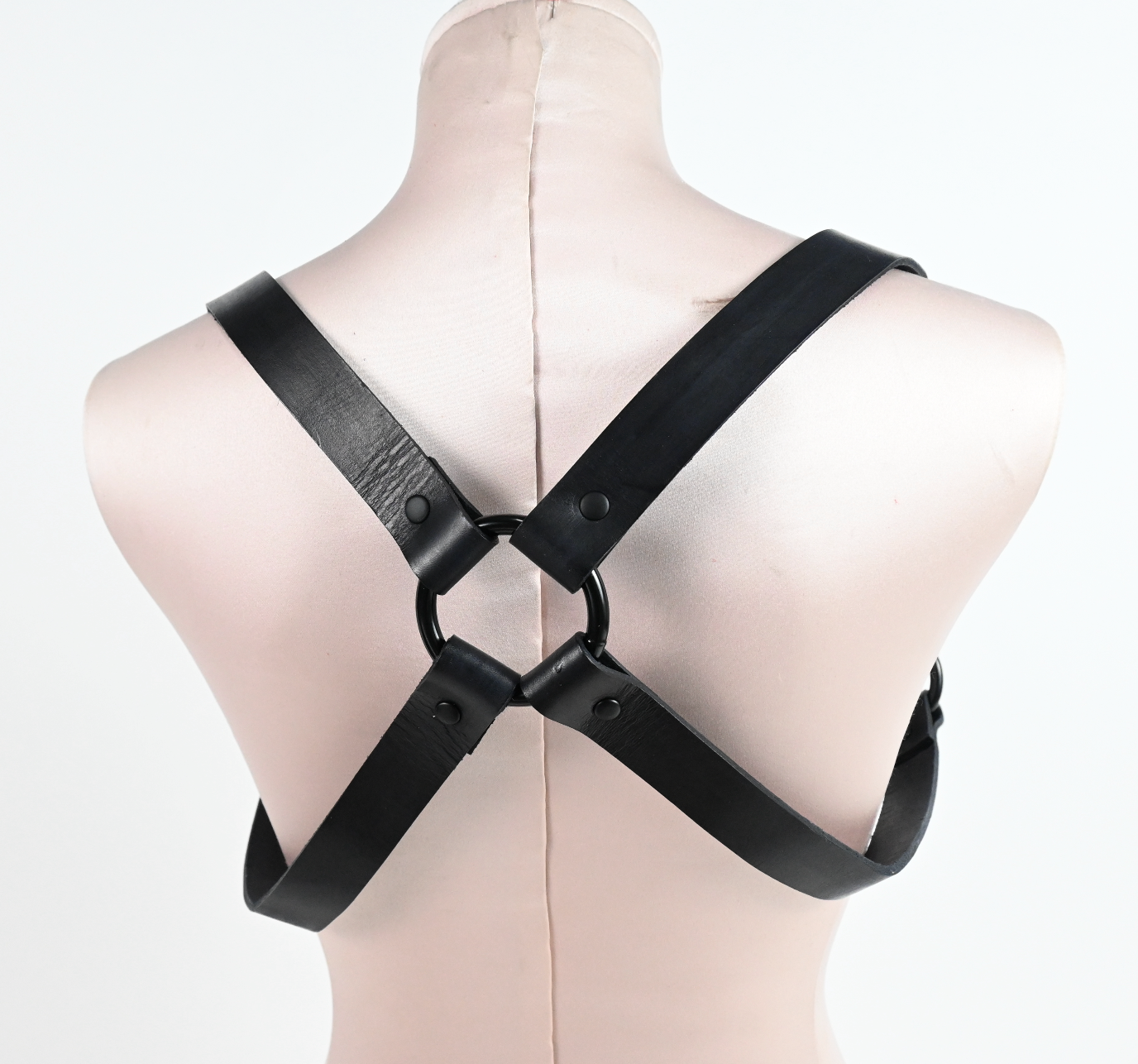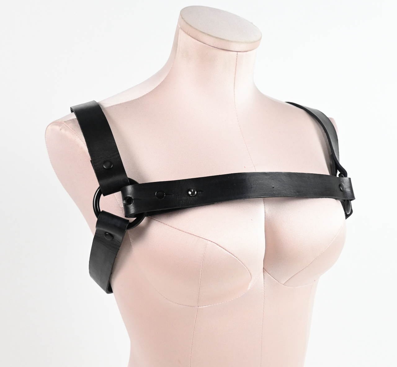 Made with thick matte black leather, black rivets, and black O-Rings. This one-size fits most, all-gender strap will add a subtle pop to any outfit.