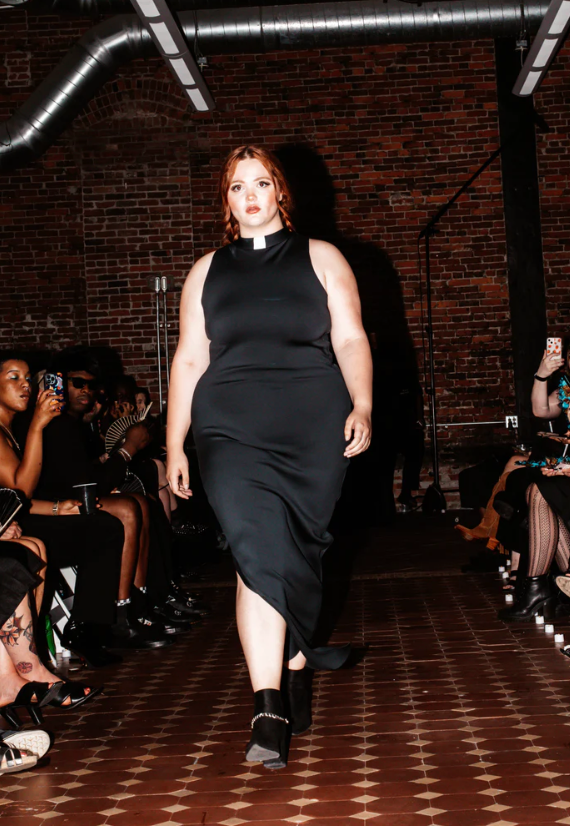 Finley is wearing a size L/XL on the runway, she is 5'9" tall, 33" waist, and wears a size 14 dress.