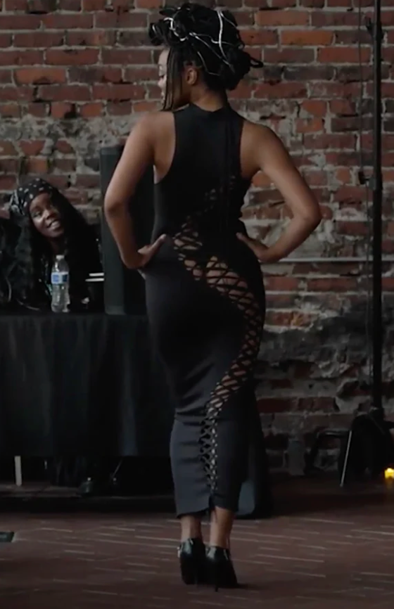 Cheyenne is wearing a size XXS/XS on the runway, she is 5'8" tall, 26" waist, and wears a size 6 dress.