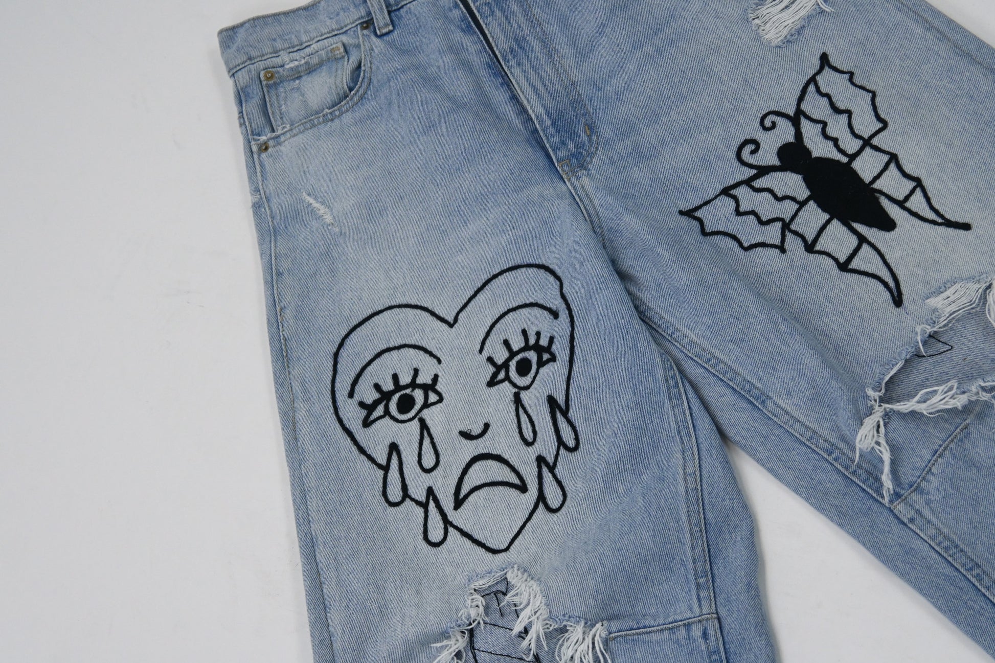 These are re-worked high rise distressed BDG denim. Chain-stitched using my 100 year old chain-stitch machine. These are 1 of 1 and will not be made again!